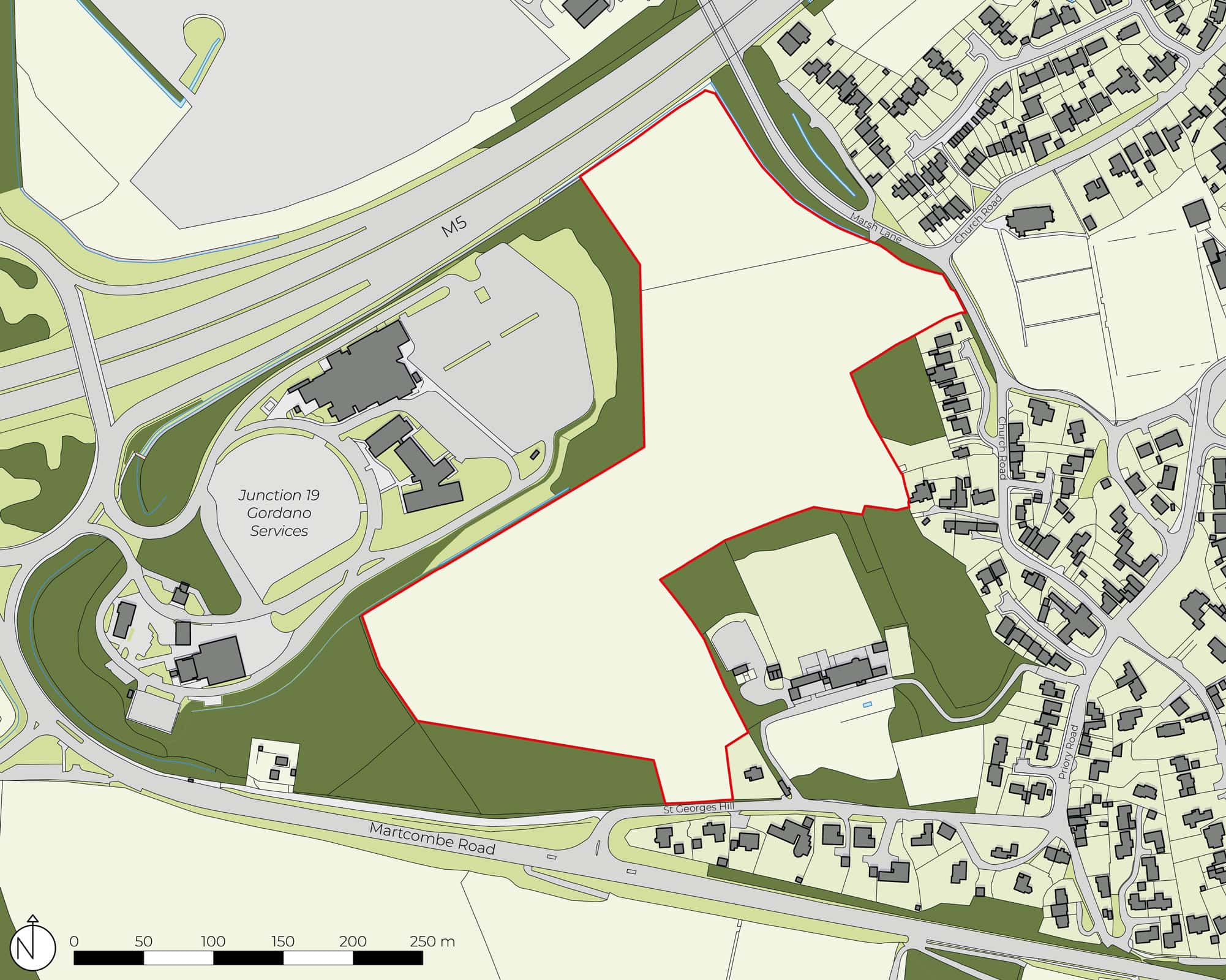 The site is strategically located, with the M5 running to the north, Gordano Services to the west, St George’s Hill and St George’s Hall to the south, and Church Road to the east.