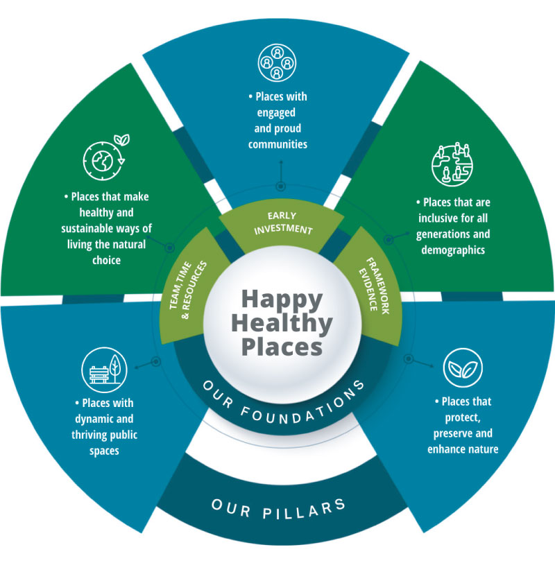 Healthy Happy Places, our placemaking pillars, encapsulates our ambitions for the places we make and the people who live there and guides all our ongoing developments, including Court House Farm. You can read through our Happy Healthy Places placemaking framework here.